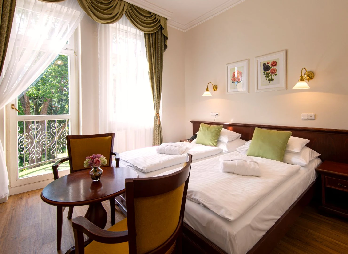- Einige Zimmer haben eine gemeinsame Terrasse oder einen Balkon. Blick entweder auf die Vorderseite des Parks oder auf die Rückseite des Waldes, jedes Zimmer hat entweder 2 Sessel oder ein Sofa.