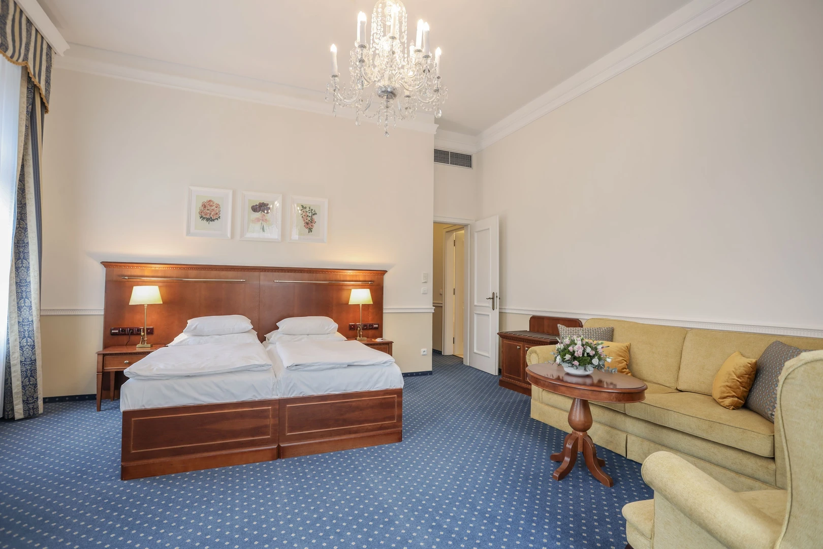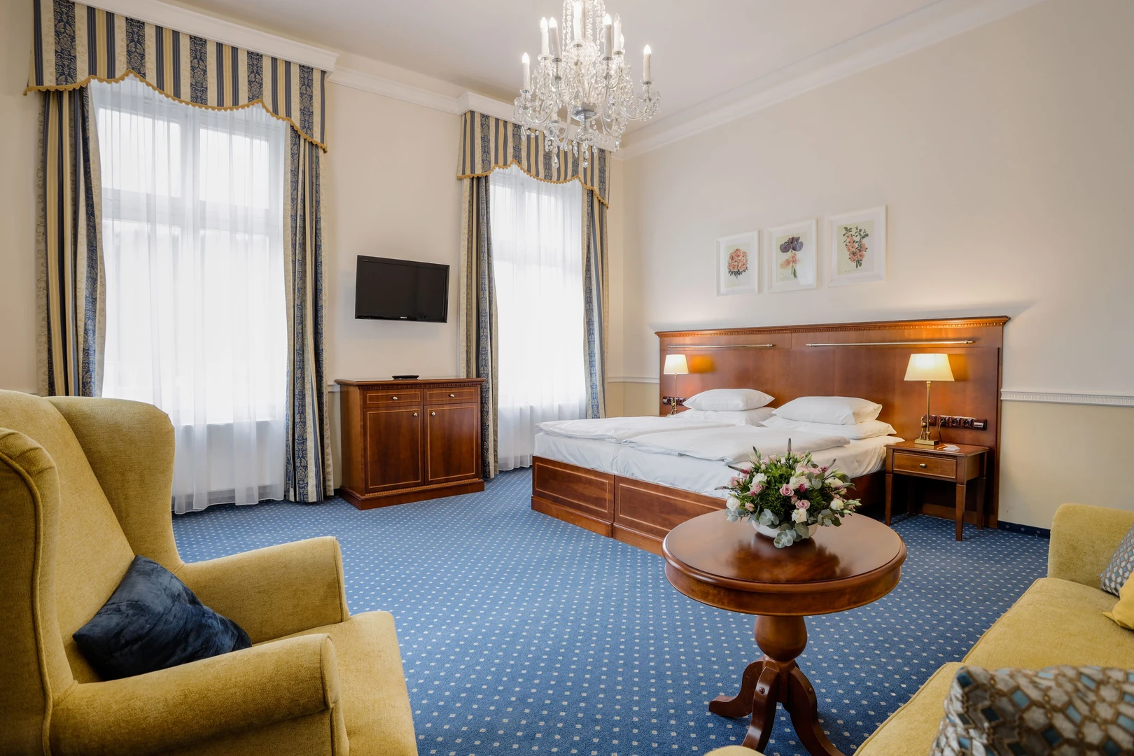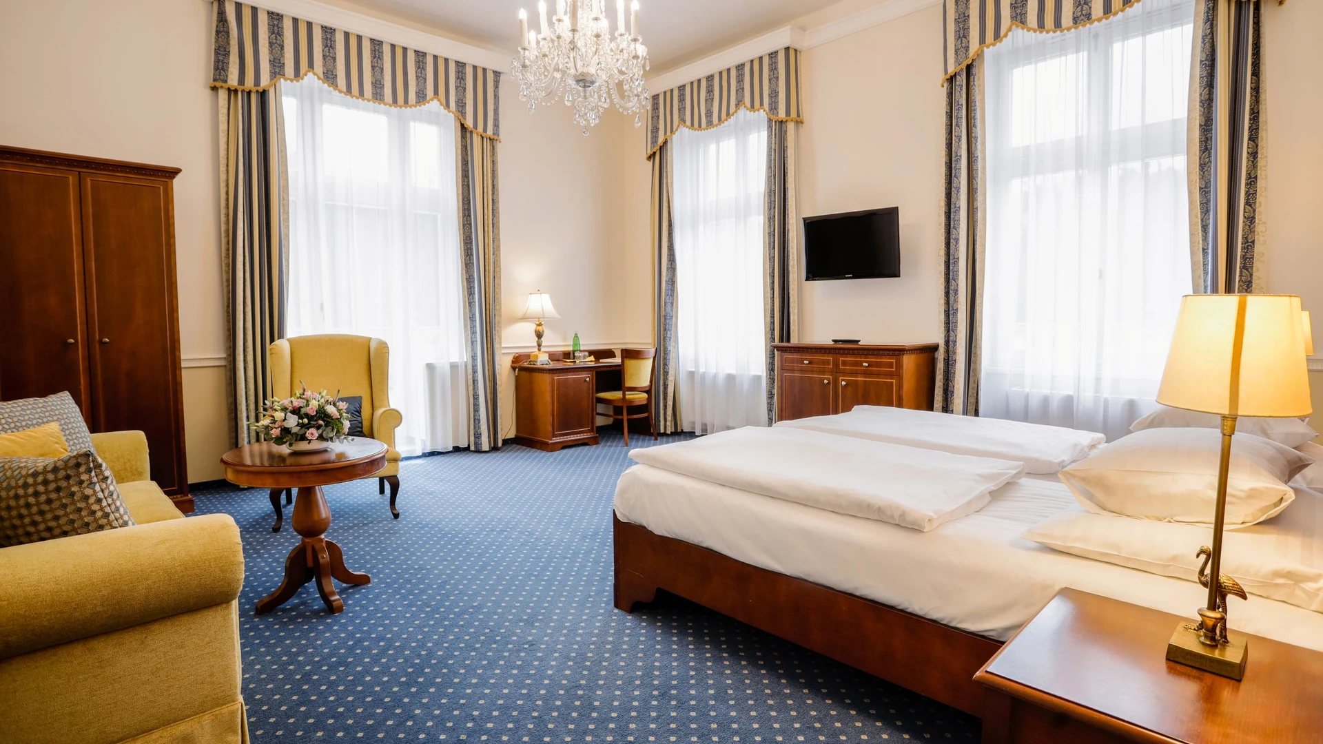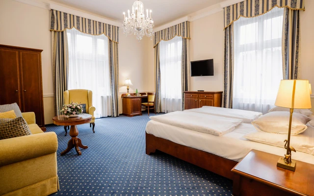 French* bed (140 cm wide), table, chair, armchair, standard furnishings, room size approx. 15 m² (+ hallway 3 m² + bathroom 4 m² = 22 m² in total).